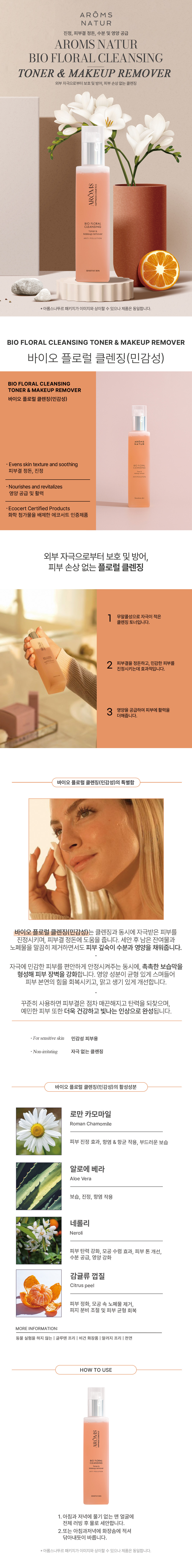 로만 카모마일의 플로럴 워터, 오렌지 플라워 네롤리 플로럴 워터, 카렌듈라, 알로에 베라, 린든 블라썸, 질경이,